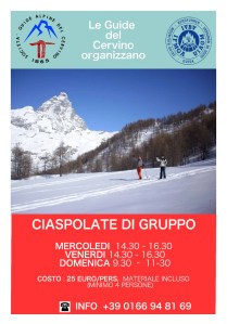 Inizia la stagione delle ciaspolate. Dal 7 dicembre e fino a fine stagione invernale, la Società delle Guide Alpine del Cervino offre la possibilità di effettuare “Ciaspolate” di gruppo di 2 ore, aperte a tutti, 3 volte alla settimana con un minimo di 4 persone, accompagnate da una guida alpina. La partenza e l’arrivo sono presso la sede delle Società Guide del Cervino.