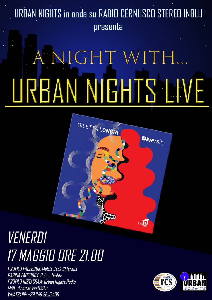 Ospite di “A night with… Urban Nights LIVE”, con una trasmissione interamente IN DIRETTA, sarà la cantante lecchese Diletta Longhi che, accompagnata in studio dal chitarrista Francesco Mascio con il quale eseguirà i consueti brani dal vivo, presenterà il proprio album d’esordio pubblicato con “Birdbox Records” dal titolo “Diversity”: progetto composto da brani originali, accomunati da un concept davvero interessante.