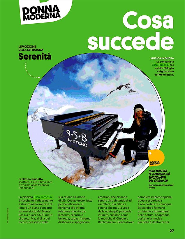 Nelle foto Elisa Tomellini e il suo concerto per pianoforte solo realizzato sul ghiacciaio del Monte Rosa. Il concerto realizzato nel 2017 รจ stato considerato “Evento mediatico dell’anno” con la notizia ripresa a livello mondiale da tutti i mass media. Stefania Schintu ha seguito con Elisa Tomellini tutti i momenti dalla ideazione, alla pianificazione del sul “sogno” di unire le sue piรน grandi passioni, la musica, il pianoforte e la montagna.
